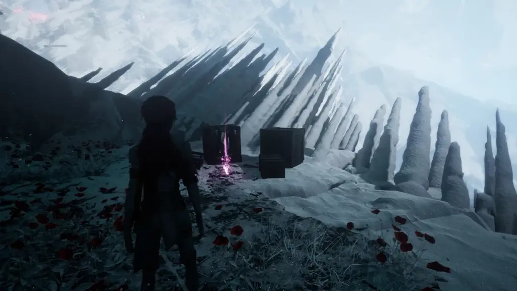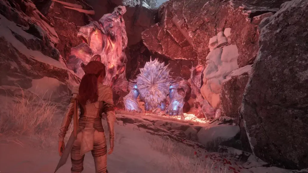 まずは岩壁沿いの光る氷に沿って進みます。グラップルで移動し、洞窟の中をさらに進みます。