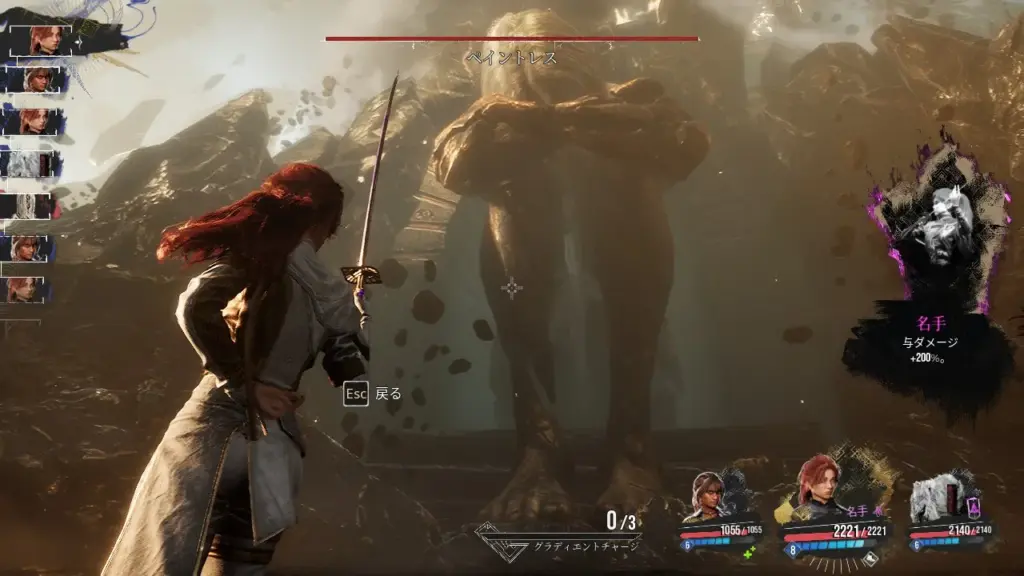 ペイントレスとは2回戦います。攻撃回数が多い全体攻撃を使ってきます。遠征隊カウンターで反撃しましょう。グラディエントアタックは『グラディエントアタックを実行する』とわざわざ教えてくれるので親切です。こちらはグラディエントカウンターを合わせましょう。1戦目より2戦目の方が強いので、グラディエントチャージは2戦目に温存しておくと良いです。