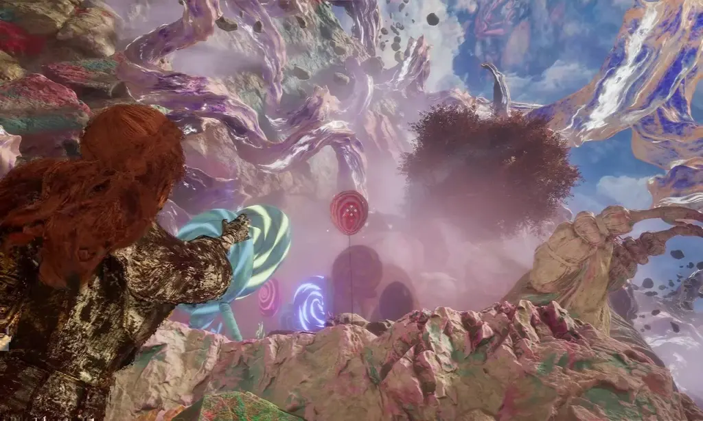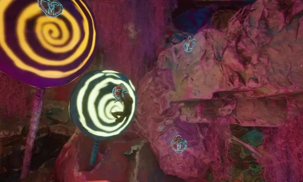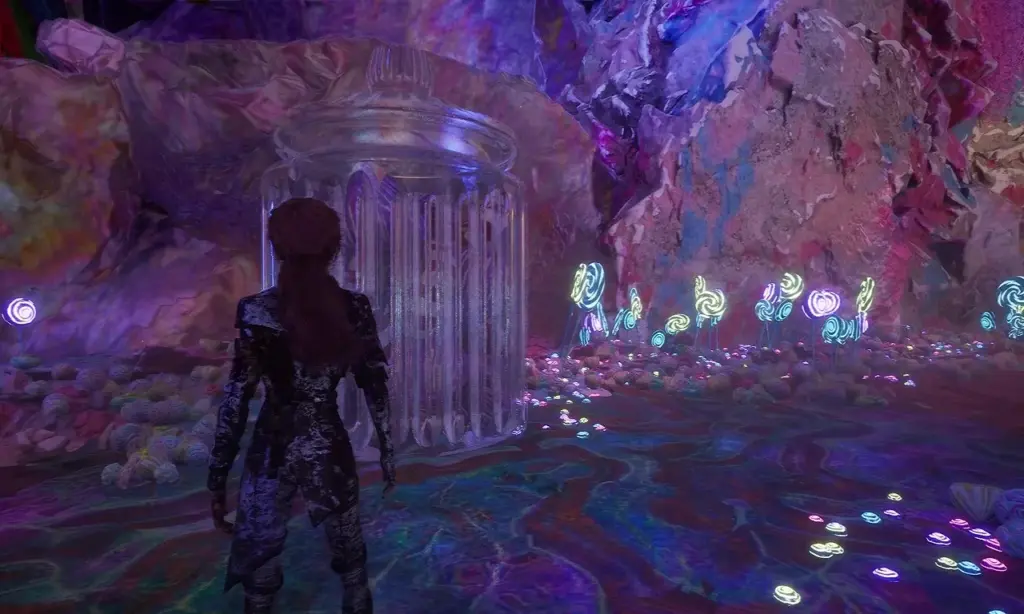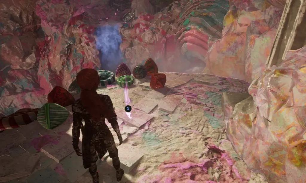 この広場から左に進むと、『キャンディランド』、右に進むと、『ジェストラルの温泉』、まっすぐ進むと『空想の道』というエリアに行けます。まずは左の『キャンディランド』のある方へ進みます。洞窟のような入り口で、2つの大きな水色のキャンディが目印です。