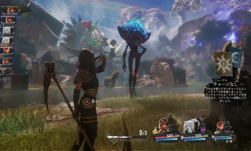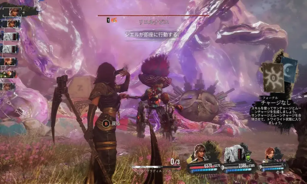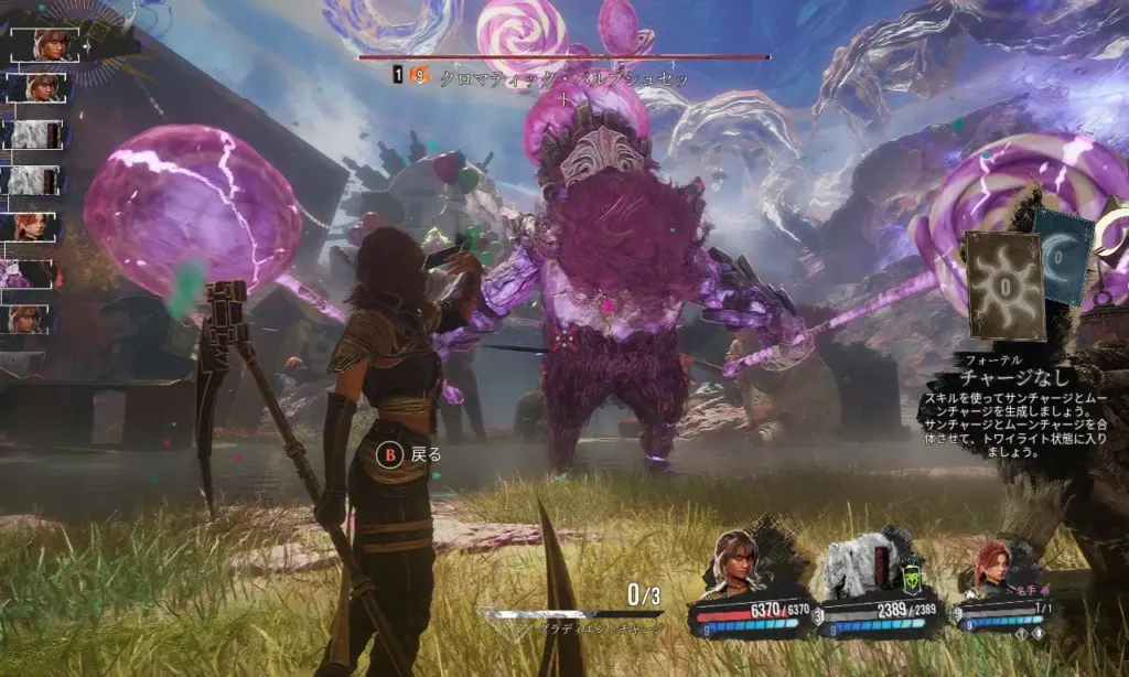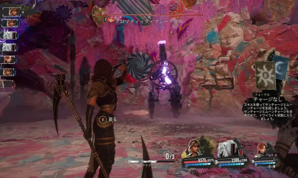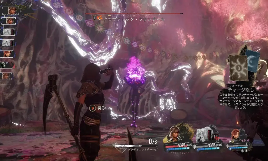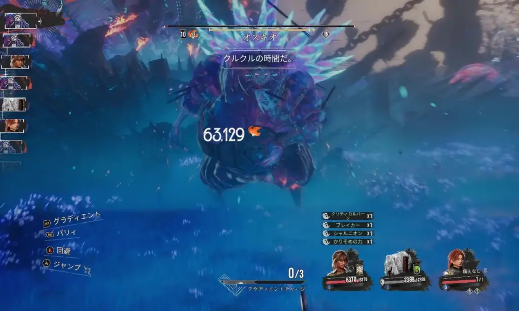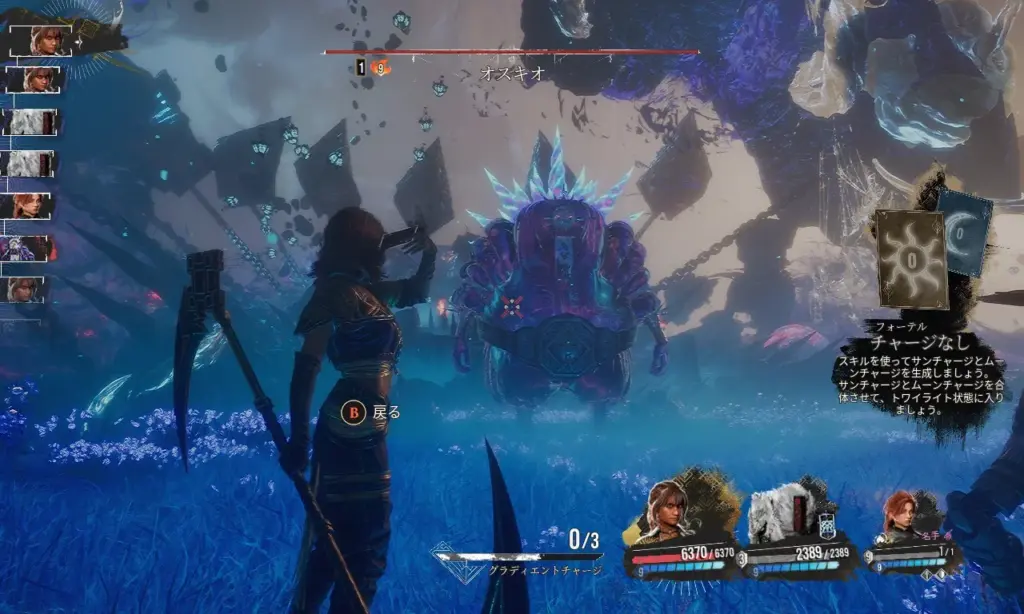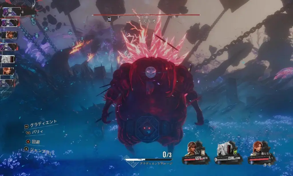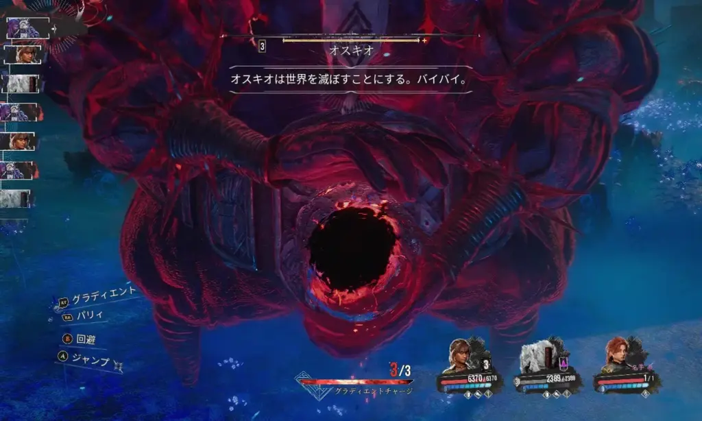 2戦目も特別なことはなく1戦目のように戦いは進められますが、問題なのは最後です。HPを削りきると「オスキオは世界を滅ぼすことにする。バイバイ。」と表示され強力なグラディエントアタックを最後に繰り出してきます。これは当たると確定で全滅してしまうのでグラディエントカウンターが必須なのですが、カウンターのタイミングが妙につかみづらいです。くらうとやり直しなのでなんとかタイミングを覚え対処しましょう。