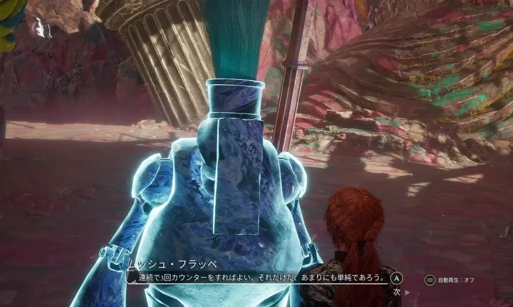 オスキオは2戦戦うことになります。「オスキオがドロップキックをしようとしている」は、素早い7連続攻撃で最後の一撃がグラディエントアタックになっています。オスキエのすべての攻撃に言えますがかなりテンポが速いので、初見では回避で対応したほうが楽かもしれません。ジャンプ回避が必要な攻撃はなさそうです。