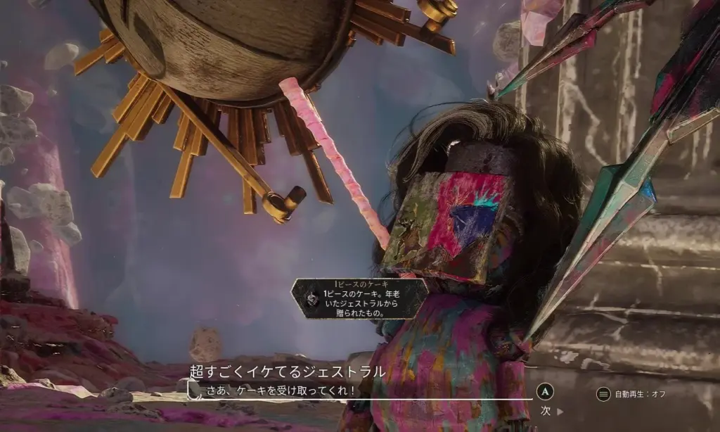 ジェストラルが落ちた場所の近くには3人組のジェストラルがいて船を探しています。滝の裏で見つけたおもちゃの船」を渡すとクエストアイテム『1ピースのケーキ』がもらえます。これで3つ揃いました。