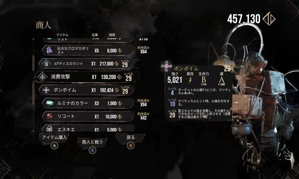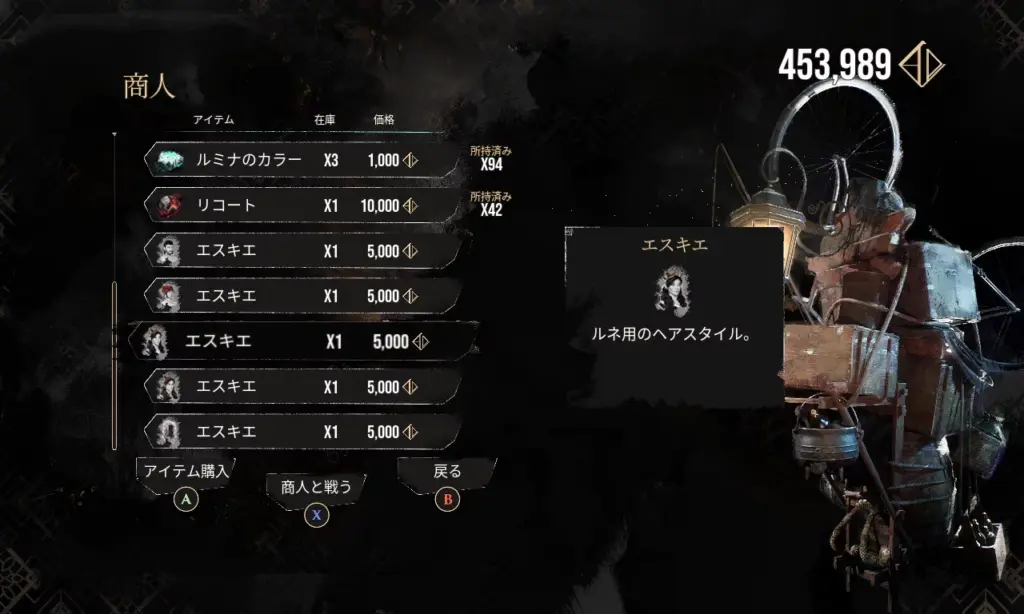 ここでしか入手できないアイテム、2つのピクトス『APディスカウント』と『消費攻撃』、ルネの武器『ボンボイム』、5人分の髪型『エスキエ』を売っています。ルネの武器のボンボイムを購入するには商人に勝つ必要があります。