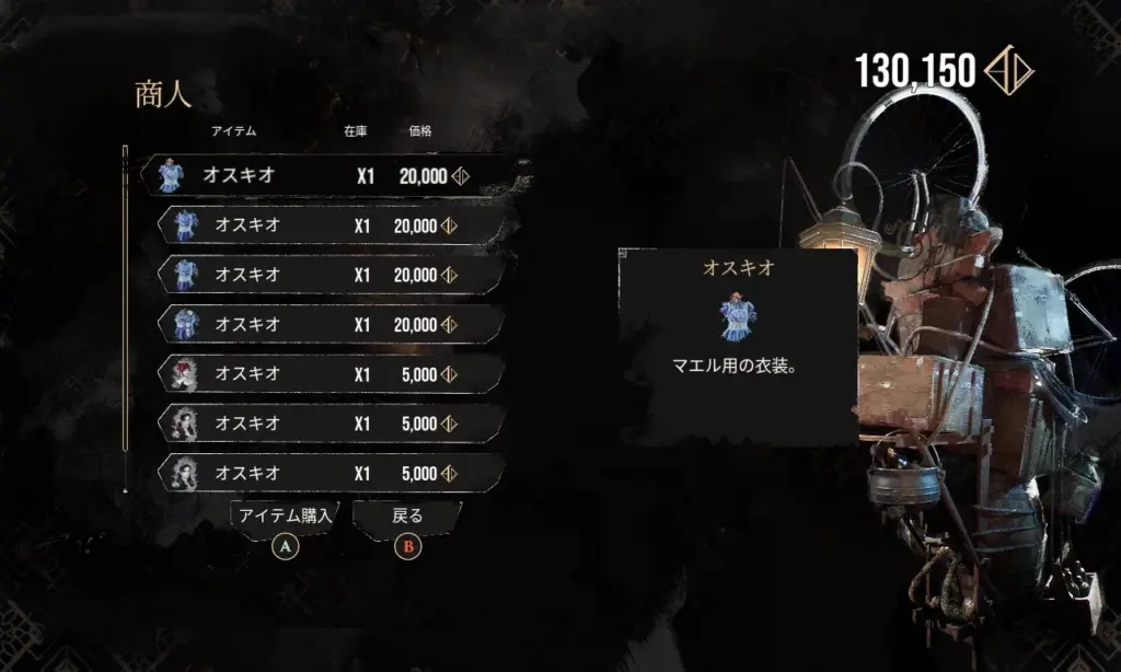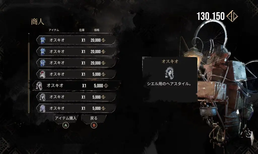 オスキオを倒すと、旗の近くにジェストラルの商人が現れます。他のメンバーの髪型と衣装『オスキオ』が購入できます。この商人とは戦うことはできません。