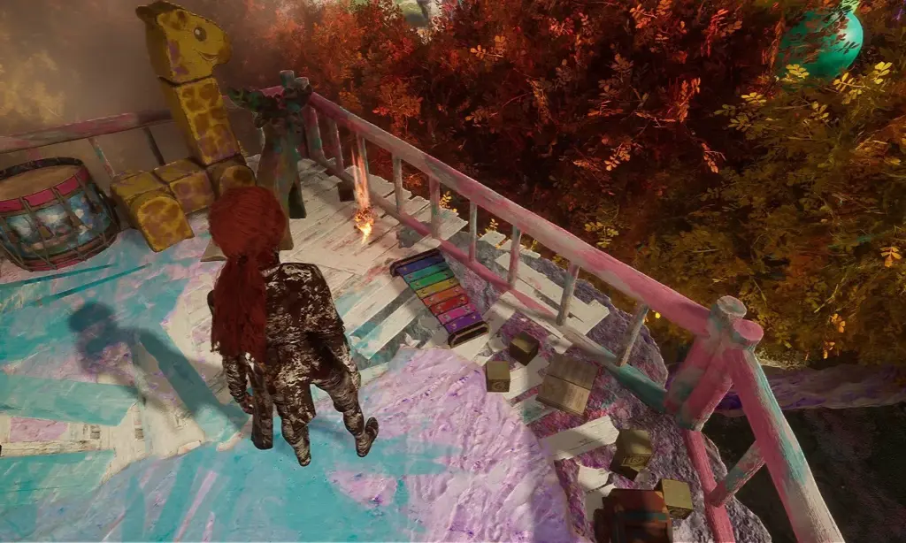 登った先では足場から足場へ飛び移ったり、細い木の足場の上を歩いたりして進みます。