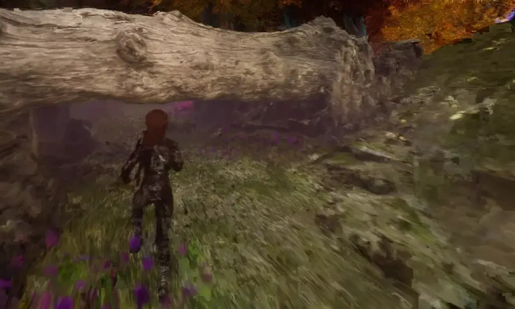 顔のある扉の近くには白い倒木があって、その下を潜り抜けることができます。