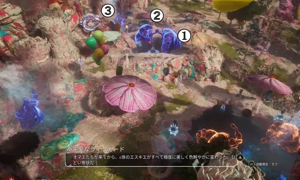 近くには不完全なライフガードがいて、エスキエの像の色を戻すように求められます。像を調べると色がオレンジから青に変わりますが、6体ある像のうち正しい像のみ青に戻せばよいようです。