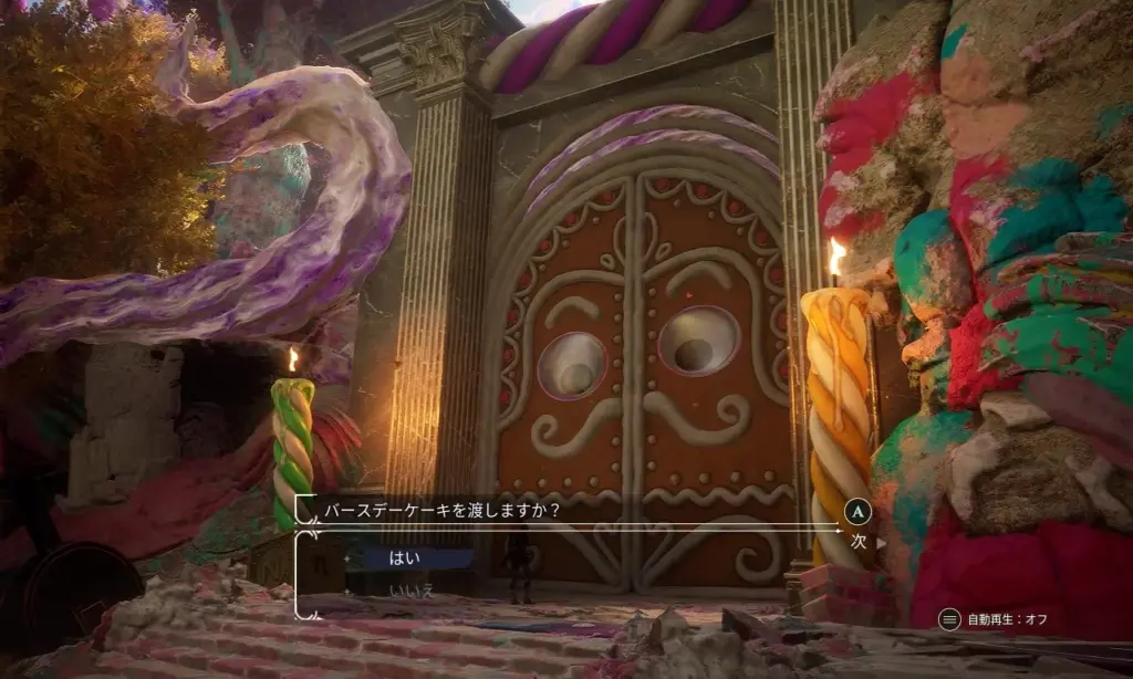 3つのケーキを集めて顔のある扉に渡すと、先に進むことができます。