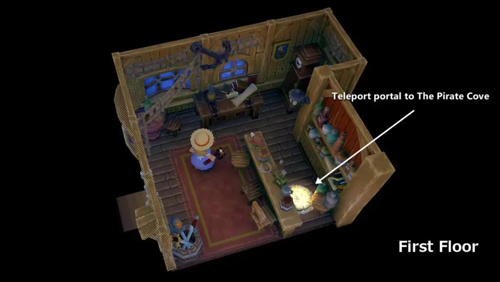 The building has two entrances. One leads to the first-floor room, which contains a teleport portal to The Pirate Cove.